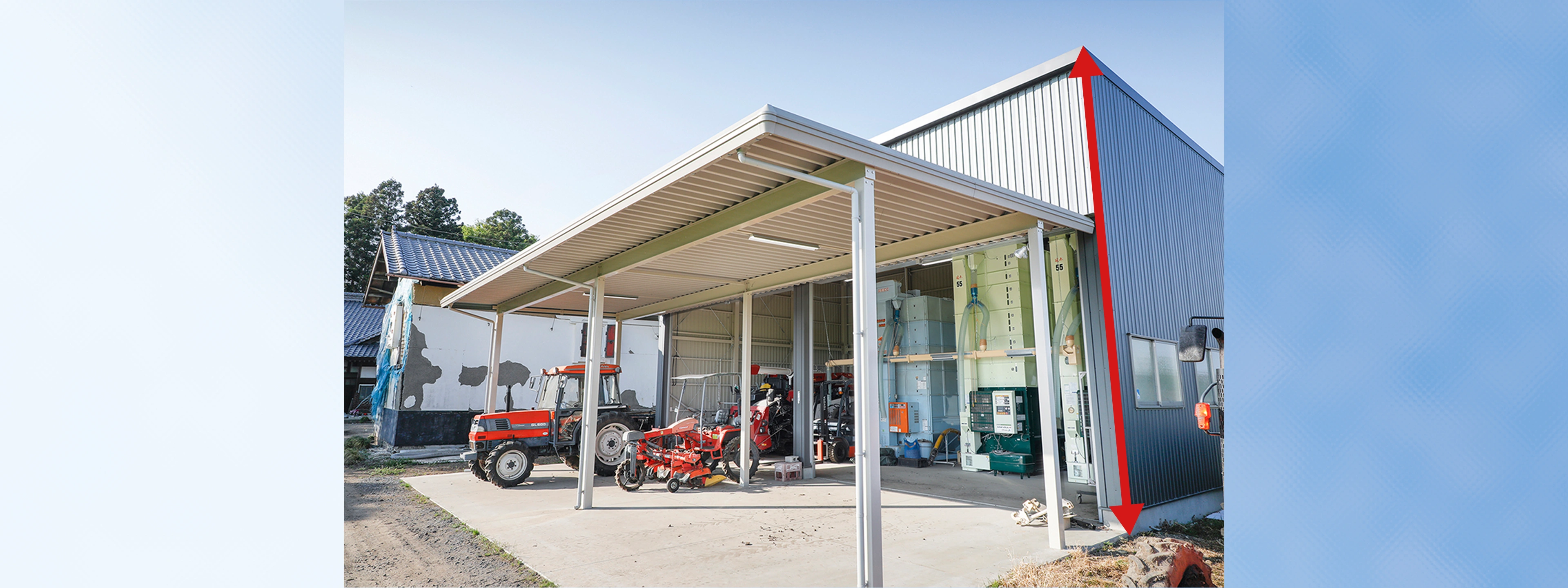 高さ7mの大型倉庫までございます。80石の乾燥機や大型農業機械もラクラク収納できます。